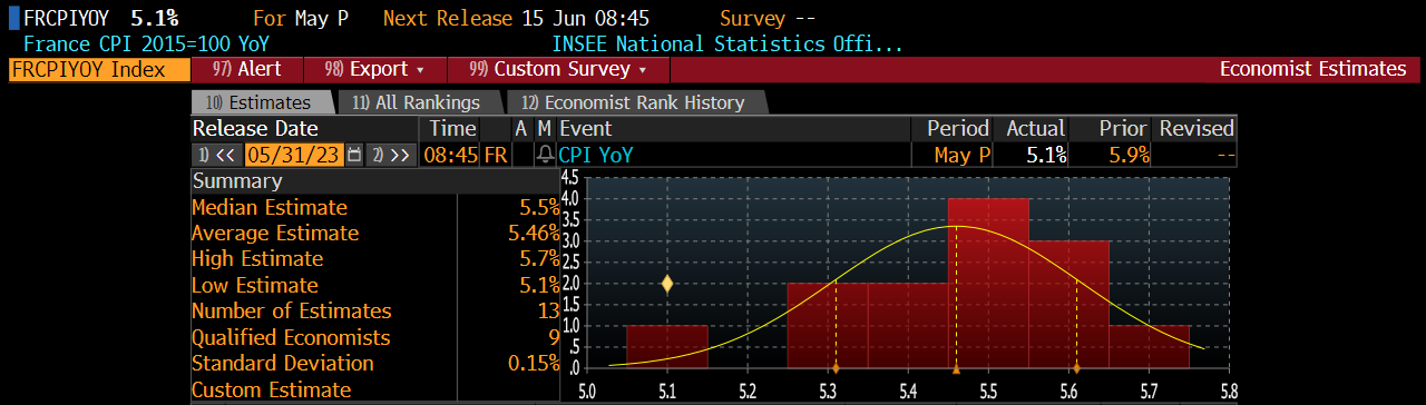 Tỷ lệ thay đổi giá tiêu dùng hàng năm tại nền kinh tế lớn thứ hai của khu vực đồng euro đã giảm xuống 5,1% so với cùng kỳ trong tháng 5 từ mức 5,9% trong tháng 4. Các nhà phân tích đã dự đoán mức đọc là 5,5%. Nguồn: Bloomberg