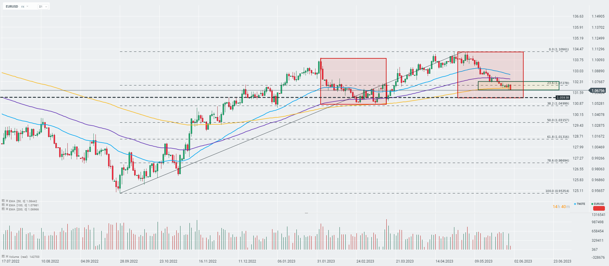 Do lạm phát giảm mạnh, cặp EURUSD đang giao dịch với mức giảm đáng kể vào sáng nay, theo mức độ của chúng, đã phá vỡ mức hỗ trợ quan trọng ở mức thấp nhất của ngày hôm qua và đường EMA 200. Nguồn: xStation5