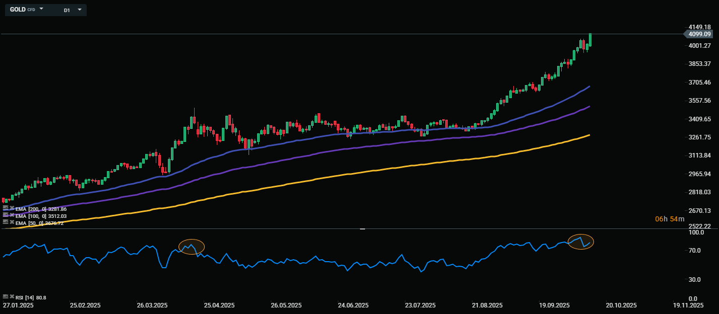 Đà tăng này có thể được thúc đẩy bởi kỳ vọng ngày càng cao về các đợt cắt giảm lãi suất tiếp theo tại Mỹ và dòng tiền liên tục đổ vào các quỹ ETF tập trung vào vàng cũng như các ngân hàng trung ương. Thông báo của ông Trump về khả năng áp thuế 100% đối với hàng hóa Trung Quốc và hạn chế xuất khẩu phần mềm quan trọng đã làm tăng lo ngại trên thị trường. Điều này càng được củng cố bởi việc Trung Quốc siết chặt hơn nữa các hạn chế xuất khẩu kim loại đất hiếm, làm gia tăng rủi ro cho chuỗi cung ứng toàn cầu. Sự hồi phục của các chỉ số chỉ là tạm thời, trong khi vàng tiếp tục duy trì đà tăng như một tài sản trú ẩn an toàn. Tình hình này cho thấy thị trường vẫn chưa tin vào việc hạ nhiệt căng thẳng lâu dài — do đó, vàng tiếp tục được hưởng lợi từ sự bất ổn toàn cầu.