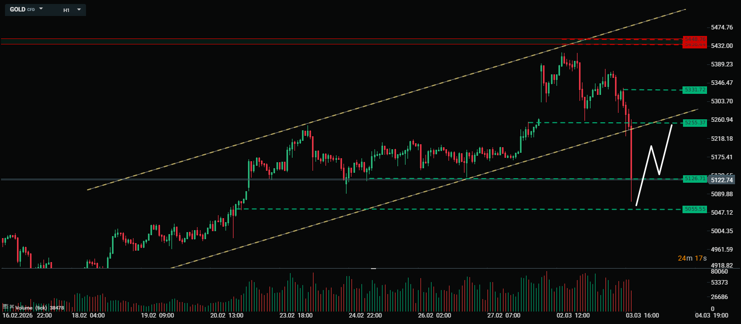 Về kỹ thuật, giá Vàng đã phá vỡ kênh tăng kéo dài từ ngày 18/02, xuyên thủng vùng hỗ trợ quan trọng và mở ra áp lực bán mạnh. Nếu mốc 5.200 USD không lấy lại được trước khi mở phiên Mỹ tối nay, đà giảm có thể tiếp diễn, hướng tới các vùng hỗ trợ tiếp theo. Điểm đáng chú ý lúc này là khu vực 5.125 USD hoặc 5.055, nơi khả năng phe mua sẽ can thiệp để bảo vệ xu hướng.