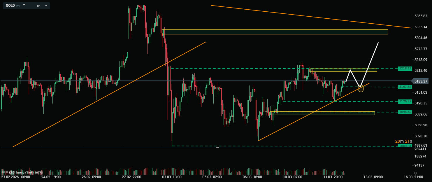 Ngược lại, trong trường hợp giá chỉ tiếp cận vùng kháng cự rồi nhanh chóng quay đầu giảm và phá vỡ xuống dưới đường xu hướng tăng ngắn hạn (đường màu cam), áp lực bán có thể gia tăng mạnh mẽ. Khi đó, kịch bản giá quay trở lại kiểm tra vùng hỗ trợ quan trọng quanh 5.000 USD/oz hoàn toàn có thể xảy ra.