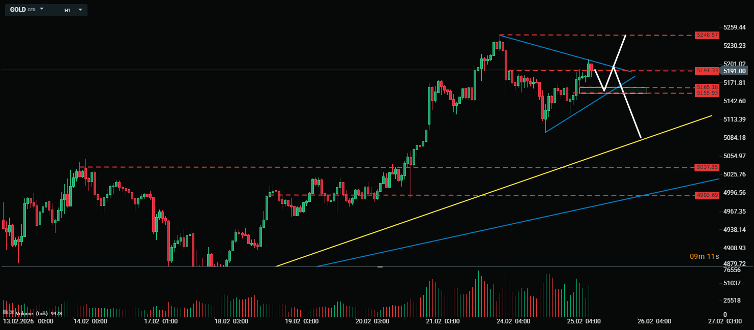 Việc giá Vàng vượt lên trên mức 5.200 USD/oz đang tiếp tục tạo ra động lực cho phe mua trong phiên ngày hôm nay. Lực tăng sẽ mạnh lên nếu giá thêm một lần nữa vượt lên trên $5.207, qua đó tạo tiền để để giá tiếp tục hướng tới mức đỉnh gần đây là $5.248. Tuy nhiên, có một điểm cần lưu ý, vùng hỗ trợ quanh mốc $5.165 sẽ đóng vai trò là điểm cản trong ngắn hạn, việc không thể bảo vệ thành công quanh khu vực này sẽ giúp cho phe bán gia tăng áp lực đẩy giá về những vùng giá thấp hơn như khu vực được đánh dấu bởi đường xu hướng tăng trong ngắn hạn (đường màu vàng).