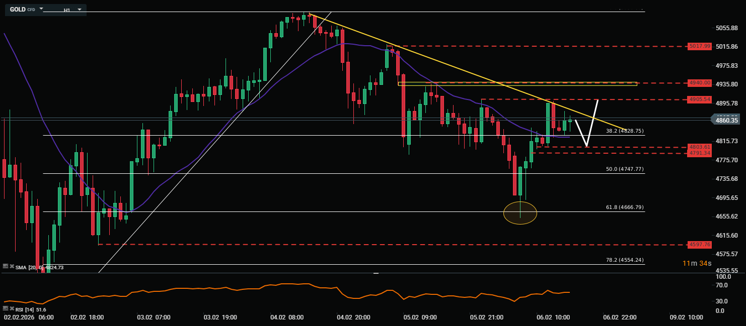 Ở thời điểm hiện tại, phe mua nhiều khả năng sẽ gặp trở ngại tại vùng quanh 4.880 USD/oz, do đây là khu vực hội tụ với đường xu hướng giảm đóng vai trò kháng cự. Vì vậy, một nhịp điều chỉnh ngắn hạn trước khi lực mua quay trở lại được xem là kịch bản hợp lý trong bối cảnh hiện tại.
