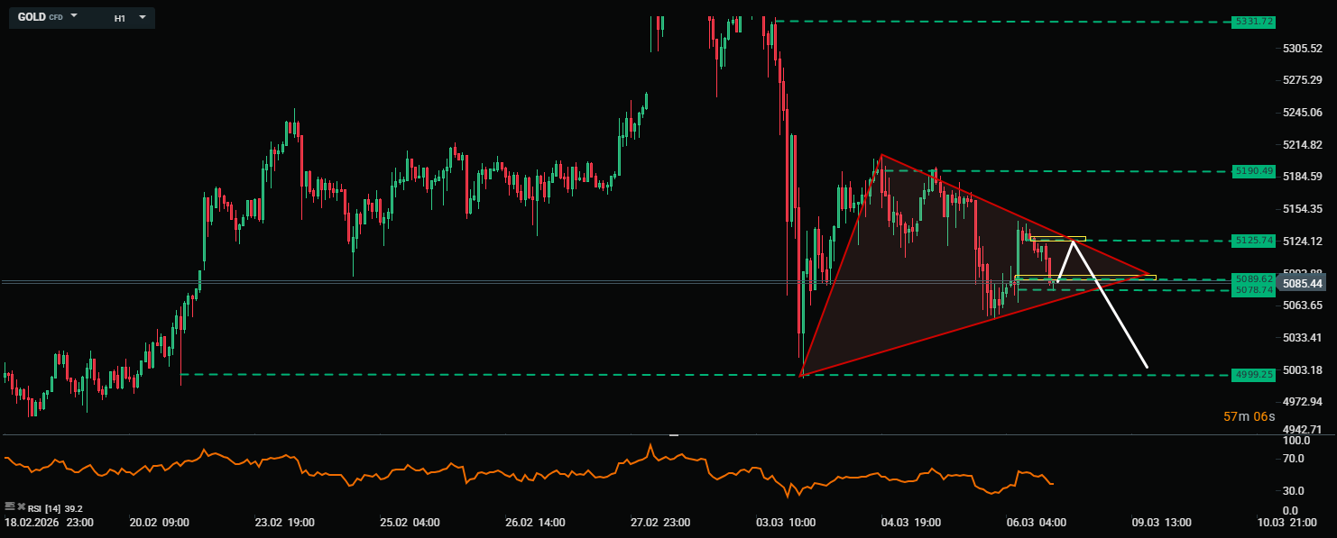 Sau nhịp giảm gần đây, giá Vàng đang có dấu hiệu chững lại và hình thành nhịp tích lũy trong vùng tam giác trên biểu đồ. Quan sát kỹ cho thấy phe bán vẫn chiếm ưu thế với những cây nến giảm mạnh và thân nến dài, trong khi phe mua vẫn còn yếu, thể hiện bởi các đỉnh sau thấp hơn đỉnh trước. Do đó, nếu giá xuyên thủng xuống dưới vùng tam giác sẽ kích hoạt áp lực từ phe bán, đẩy giá về mức đáy gần nhất quanh 5.000 USD. Ngược lại, một nhịp bứt phá vượt lên trên vùng tam giác và phá qua ngưỡng 5.200 USD sẽ kích hoạt đà tăng mới, mở ra cơ hội hướng đến mức đỉnh lịch sử.