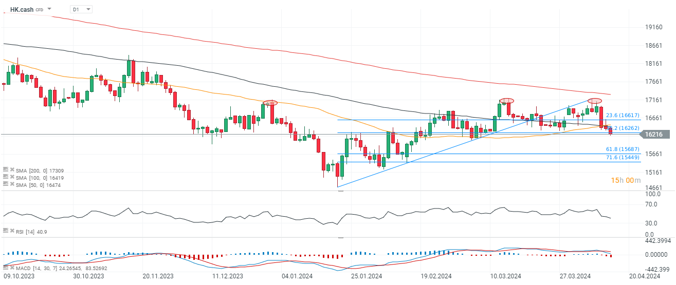 Chỉ số HK.cash đang gặp phải lực cản mạnh, được thiết lập bởi các phản ứng giá trước đó (xung quanh mức 17.200 điểm, được khoanh tròn màu đỏ) và đường trung bình SMA200 (đường màu đỏ). Nếu phe mua không thể đẩy chỉ số vượt qua mức Fibonacci thoái lui 38,2%, thì khả năng chỉ số sẽ kiểm tra lại mức thoái lui 61,8% ở khu vực 15.700 điểm. Bên cạnh đó, nếu chứng khoán Phố Wall tiếp tục lao dốc thì tâm lý thị trường Trung Quốc cũng có thể xấu thêm.