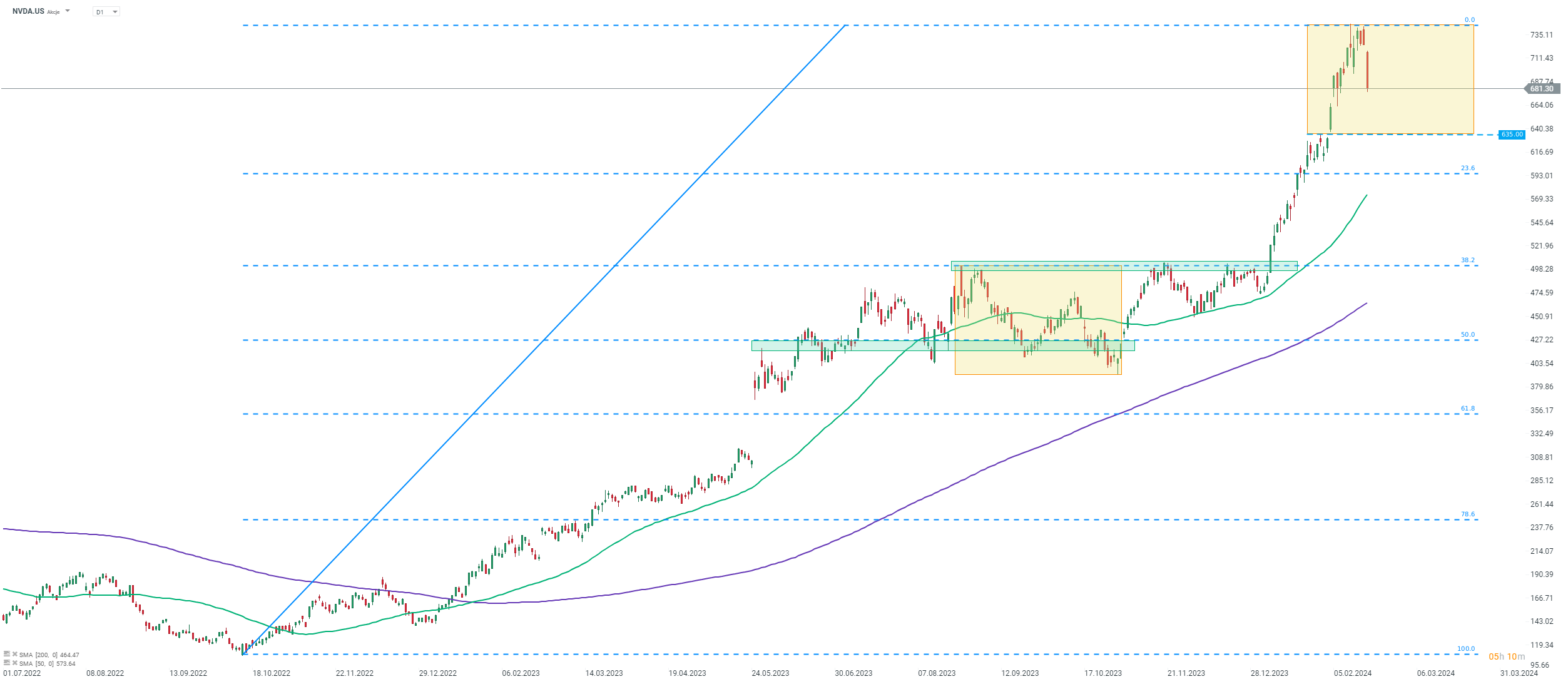 Cổ phiếu Nvidia (NVDA.US) đang giảm hơn 5% trong phiên hôm nay và đang hướng đến phiên giảm mạnh nhất kể từ tháng 10 năm 2023. Cổ phiếu đã giảm xuống mức đáy được thiết lập vào ngày 7 tháng 2 năm 2024 ở mức 700 USD/cổ phiếu. Không có tin tức cụ thể nào về công ty được công bố để có thể giải thích cho sự sụt giảm lớn như vậy và có vẻ như các nhà đầu tư đang bán bớt cổ phiếu Nvidia trong bối cảnh không chắc chắn trước báo cáo thu nhập. Mặc dù cổ phiếu đang thấp hơn khoảng 8,5% so với mức đỉnh trong lịch sử, nhưng cần một mức giảm gần 7% nữa để giá có thể phá vỡ khỏi cạnh dưới của hình chữ nhật và gợi ý về khả năng đảo chiều xu hướng. Với mức độ biến động mạnh của cổ phiếu Nvidia, điều này có thể xảy ra ngay vào ngày mai. Thị trường quyền chọn hiện đang dự kiến cổ phiếu Nvidia sẽ biến động gần 10% sau khi công bố báo cáo thu nhập.