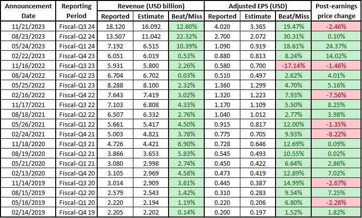 Bảng dưới đây cho thấy kết quả tài chính của Nvidia trong 20 quý gần nhất. Như bạn có thể thấy, công ty có lịch sử tốt trong việc công bố báo cáo thu nhập vượt qua dự kiến về cả doanh thu và lợi nhuận. Tuy nhiên, việc báo cáo vượt qua dự kiến doanh thu và lợi nhuận không phải lúc nào cũng khiến giá cổ phiếu tăng trưởng trong phiên sau khi công bố báo cáo thu nhập.