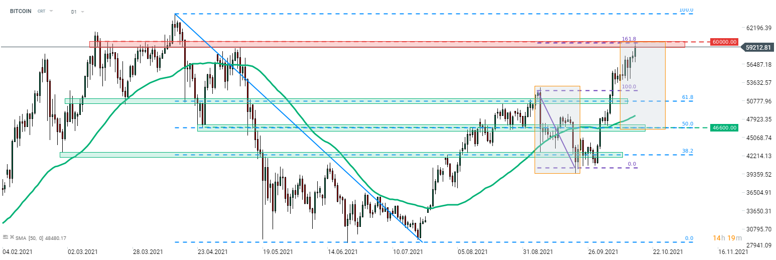 BITCOIN đã tăng trong đêm nhưng đà tăng đã dừng lại ở mức tâm lý quan trọng - mốc 60,000 USD. Ngoài bản chất tâm lý, khu vực này cũng được đánh dấu với mức Fibo 161,8% của đợt điều chỉnh giảm từ tháng Chín. Nỗ lực đầu tiên vượt qua mốc 60,000 USD đã thất bại và nếu đợt thoái lui đang diễn ra giảm sâu hơn, hỗ trợ chính đầu tiên cần theo dõi sẽ nằm ở giới hạn dưới của quỹ đạo thị trường gần mức Fibo 50% của đà giảm mạnh vào tháng 4 năm 2021 (khu vực 46.600 USD). Nguồn: xStation5