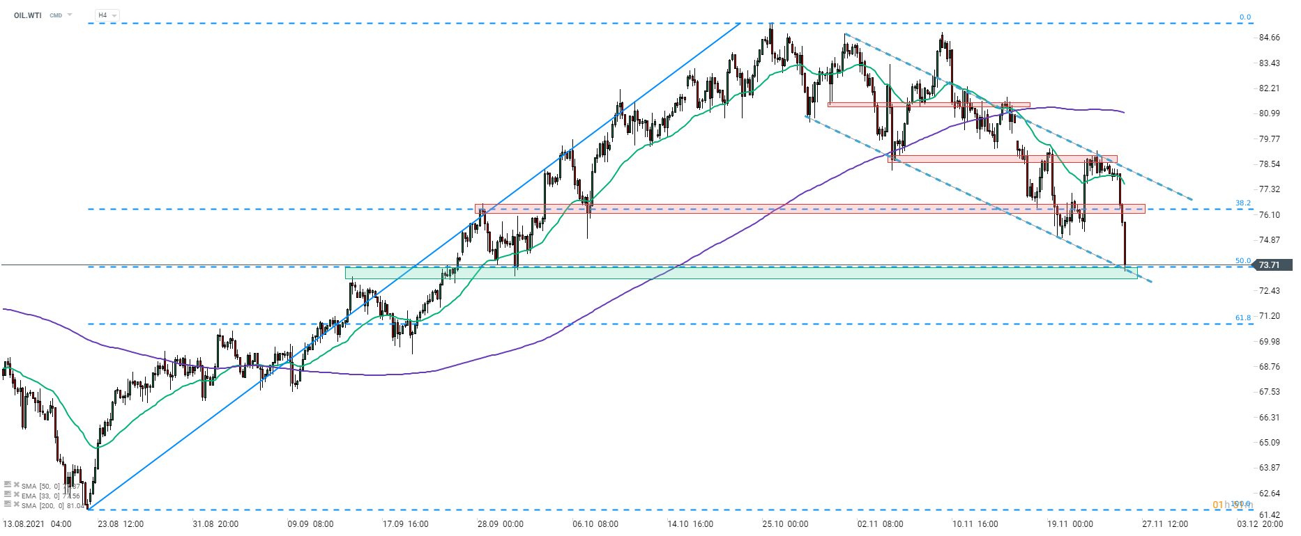 Nhìn vào biểu đồ OIL.WTI tại khoảng thời gian H4, có thể thấy giá dầu thô đã giao dịch trong kênh giảm kể từ đầu tháng 11. Giá đã tăng lên giới hạn trên của kênh vào đầu tuần này sau thông báo giải phóng nguồn dự trữ dầu chiến lược khá thất vọng. Tuy nhiên, tất cả những khoản lợi nhuận đó đã bị xóa bỏ và bây giờ WTI đang kiểm tra một vùng hỗ trợ gần mức 73,60 USD. Vùng này được đánh dấu bằng mức Fibo 50% của động thái đi lên vào tháng 8, các phản ứng giá trước đó cũng như giới hạn dưới của kênh.