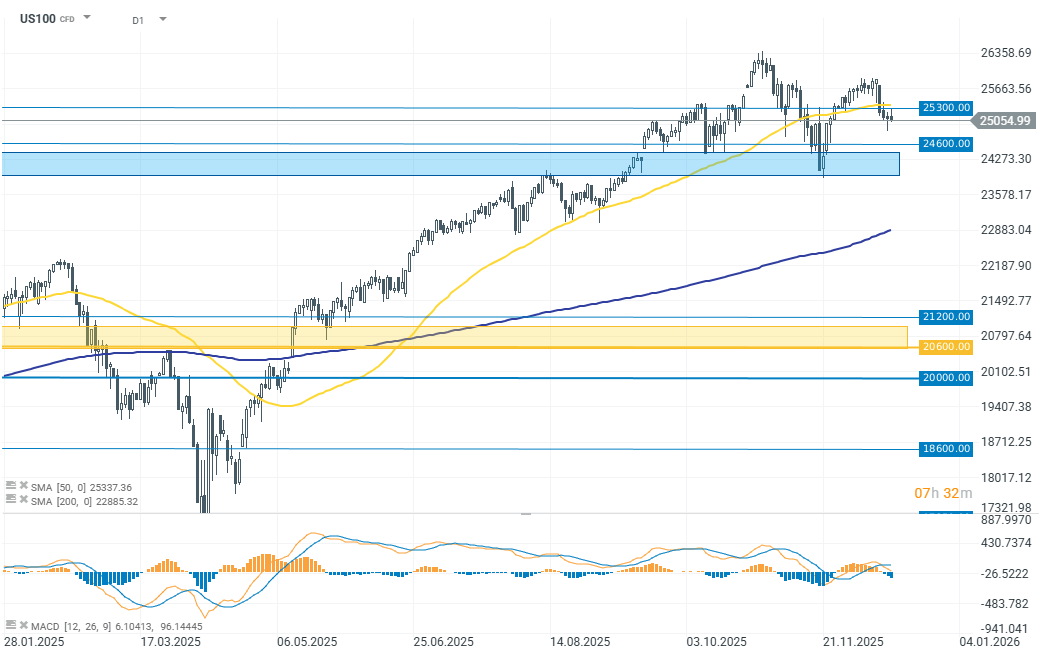 Chỉ số công nghệ đang chịu áp lực bán nhẹ trong hôm nay. Tại thời điểm viết bài, US100 giảm 0,10%, với mức giảm chủ yếu đến từ các công ty bán dẫn và công nghệ thông tin.