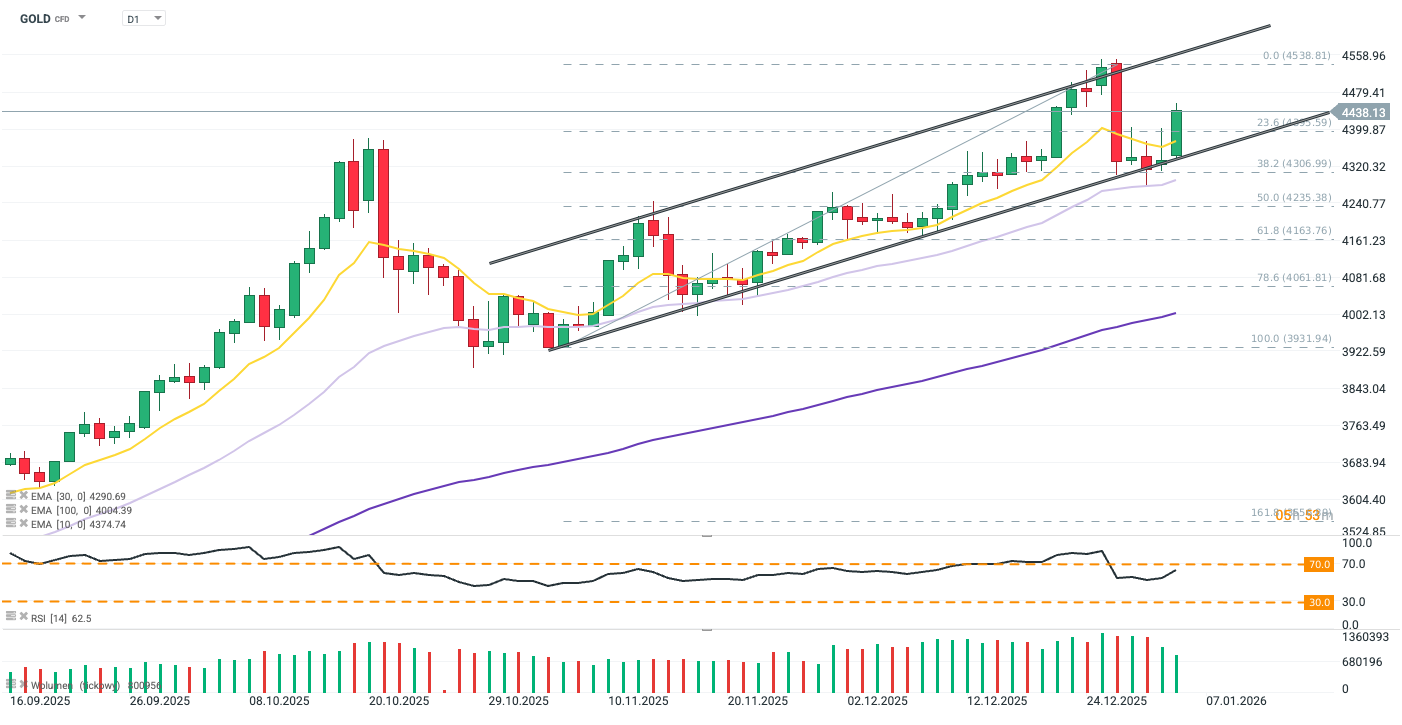 Gần đây, vàng đã dừng nhịp điều chỉnh quanh mức Fibonacci 38,2% của đợt tăng bắt đầu từ tháng 11, đồng thời bật lên từ đường biên dưới của kênh tăng giá. Nếu giá quay trở lại trên đường EMA10 (màu vàng), điều này có thể mở đường cho một nhịp tăng hướng tới đỉnh gần nhất tại 4.540 USD. Ngược lại, nếu không có leo thang quân sự giữa Venezuela và Mỹ, áp lực giảm giá có thể quay trở lại, kéo vàng về vùng 4.300 - 4.320 USD. Nguồn: xStation5