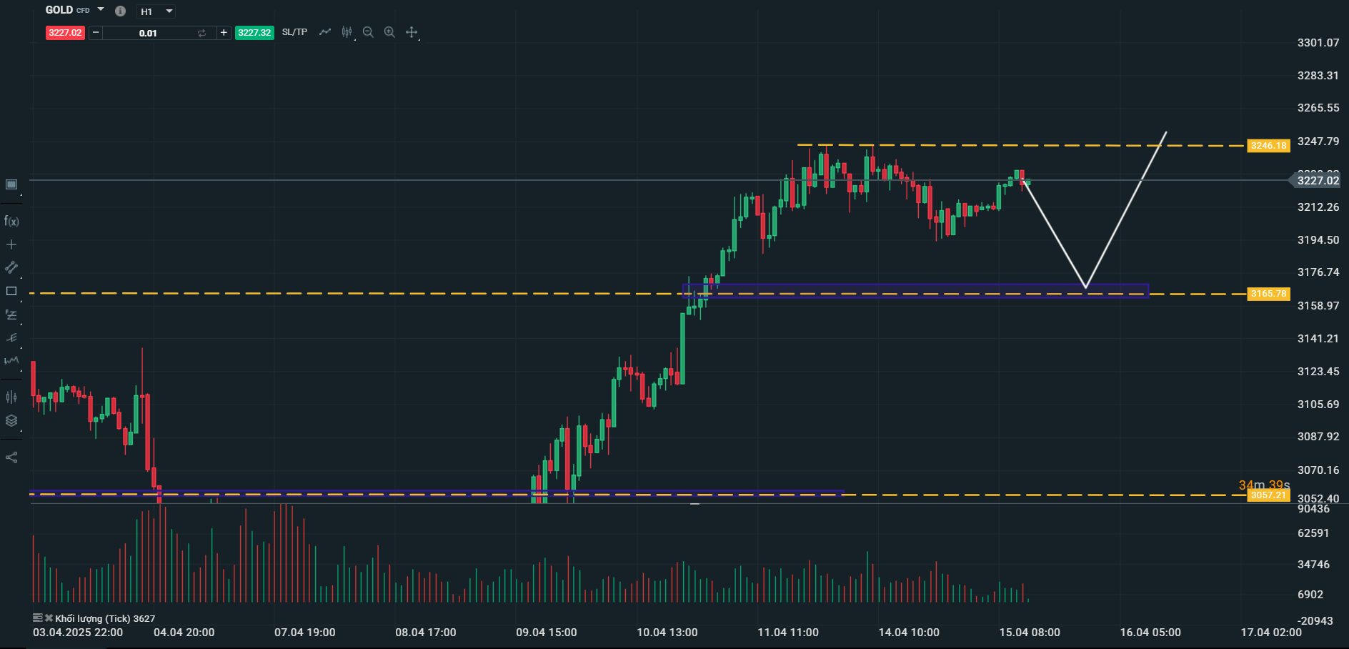 Tuy nhiên, nếu nhìn vào volume gần đây thì rõ ràng là đang yếu dần phản ánh bằng những cột thanh khoản giảm dần, điều này có ý nghĩa là đà tăng trong ngắn hạn đang có dấu hiệu chững lại. Do đó, phe bán có thể tận dụng cơ hội này để đẩy giá xuống trong những phiên sắp tới đây. Nếu như kịch bản này xảy ra, thì mốc 3.165USD/oz sẽ là khu vực đầu tiên mà chúng ta cần quan tâm. Đây cũng sẽ là vùng mà chúng ta tìm kiếm cho mình vị thế mua trong thời điểm tới.