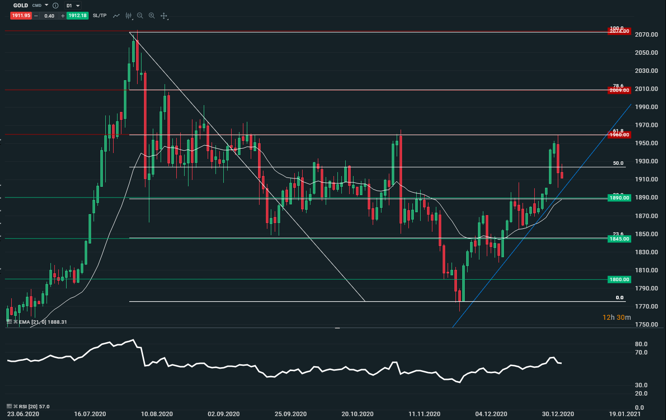 Mở màn 2021 không hề suôn sẻ cho đồng USD khiến giá vàng bị đẩy lên cao và hiện đang thách thức mốc kháng cự 1960.