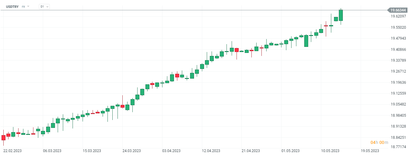 Đồng lira Turkish suy yếu nhẹ sau kết quả của vòng bầu cử đầu tiên. Người mua trên USDTRY vẫn nhận được hỗ trợ từ đường xu hướng. Nguồn: xStation5