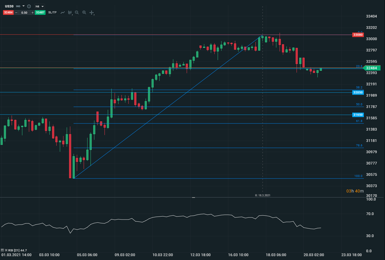 Chỉ số US30 đã có một cú điều chỉnh sau khi được đẩy giá vào tuần trước. Hiện giao động quanh ngưỡng 32450. Mốc này cũng tương đương với ngưỡng Fibo 23.6.
