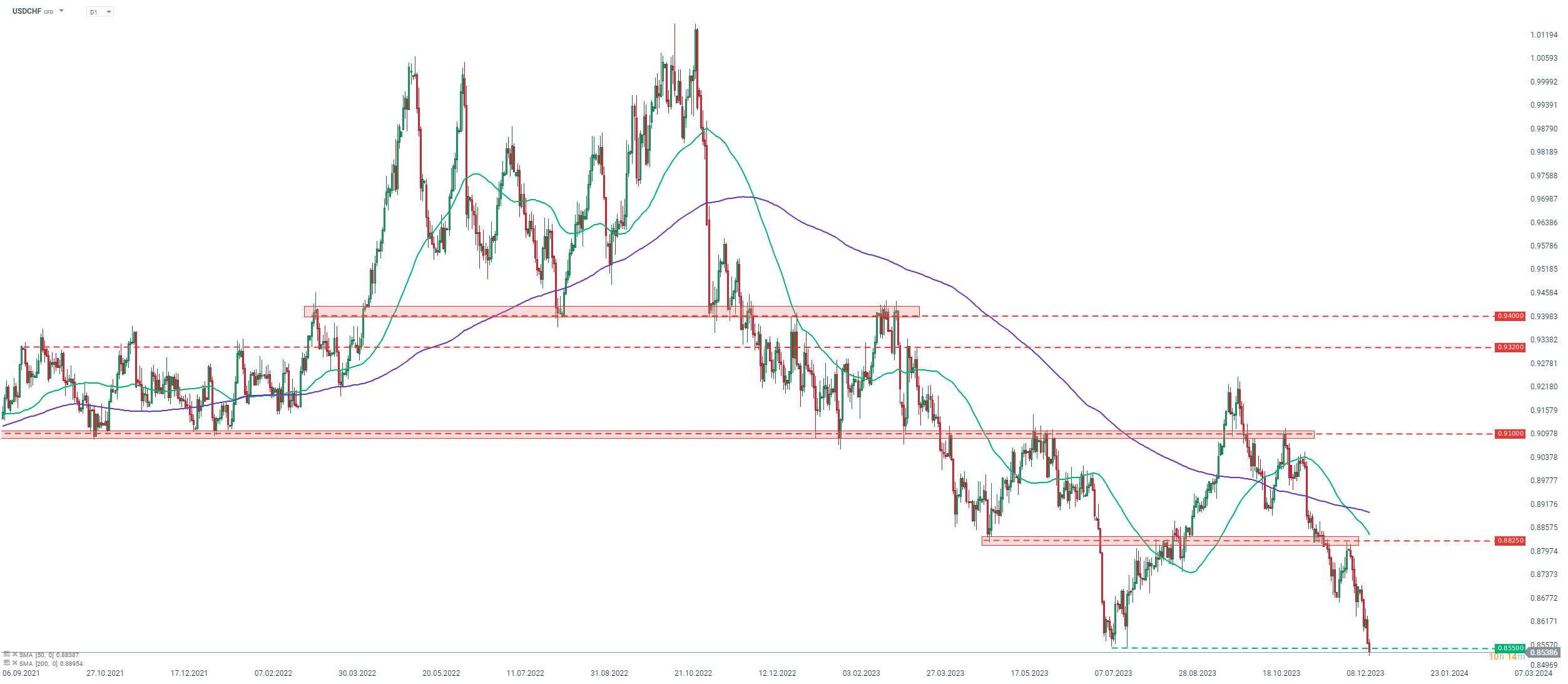 Nhìn vào biểu đồ cặp tiền USDCHF ở khung thời gian D1, có thể thấy cặp tiền đã giảm hơn 7% kể từ mức đáy được thiết lập vào đầu tháng 10 và đã phá vỡ xuống dưới mức hỗ trợ 0,8550 vào hôm nay, được đánh dấu bằng mức đáy ngắn hạn từ tháng 7 năm 2023. Kết quả là cặp tiền này đã thiết lập mức đáy mới kể từ tháng 1 năm 2015.