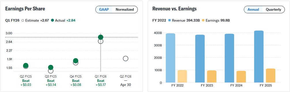 Dù bị đánh giá là “đi sau” trong cuộc đua trí tuệ nhân tạo, Apple vẫn cho thấy nội lực đáng nể khi duy trì đà tăng trưởng ổn định cả về doanh thu lẫn lợi nhuận. Việc liên tục vượt qua các dự báo của thị trường không chỉ củng cố niềm tin của nhà đầu tư, mà còn là minh chứng rõ ràng rằng chiến lược phát triển thận trọng nhưng nhất quán của hãng đang đi đúng hướng và tạo nền tảng vững chắc cho tương lai. Nguồn: YahooFinance