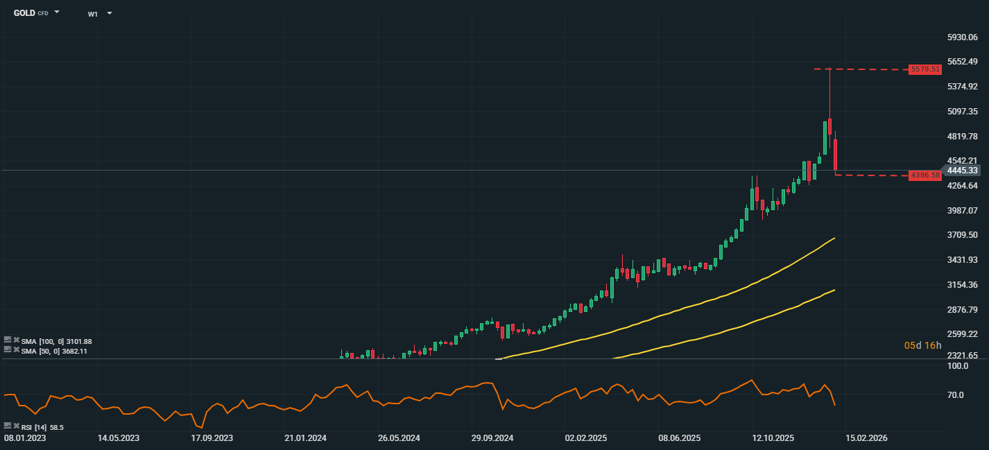 Gía Vàng tiếp tục lao dốc trong phiên đầu tiên của tháng 2. Những áp lực bán trong tuần trước vẫn tiếp tục gia tăng khiến giá Vàng tìm về các mức đáy thấp hơn. Đầu giờ chiều nay, giá Vàng đã có thời điểm chạm mức 4.400 USD/oz và nhanh chóng bật tăng. Tính từ mức đỉnh lịch sử gần 5.600 USD/oz, giá Vàng đã mất tổng cộng gần 20% giá trị và vẫn chưa có dấu hiệu dừng lại. Nguồn: xStation5