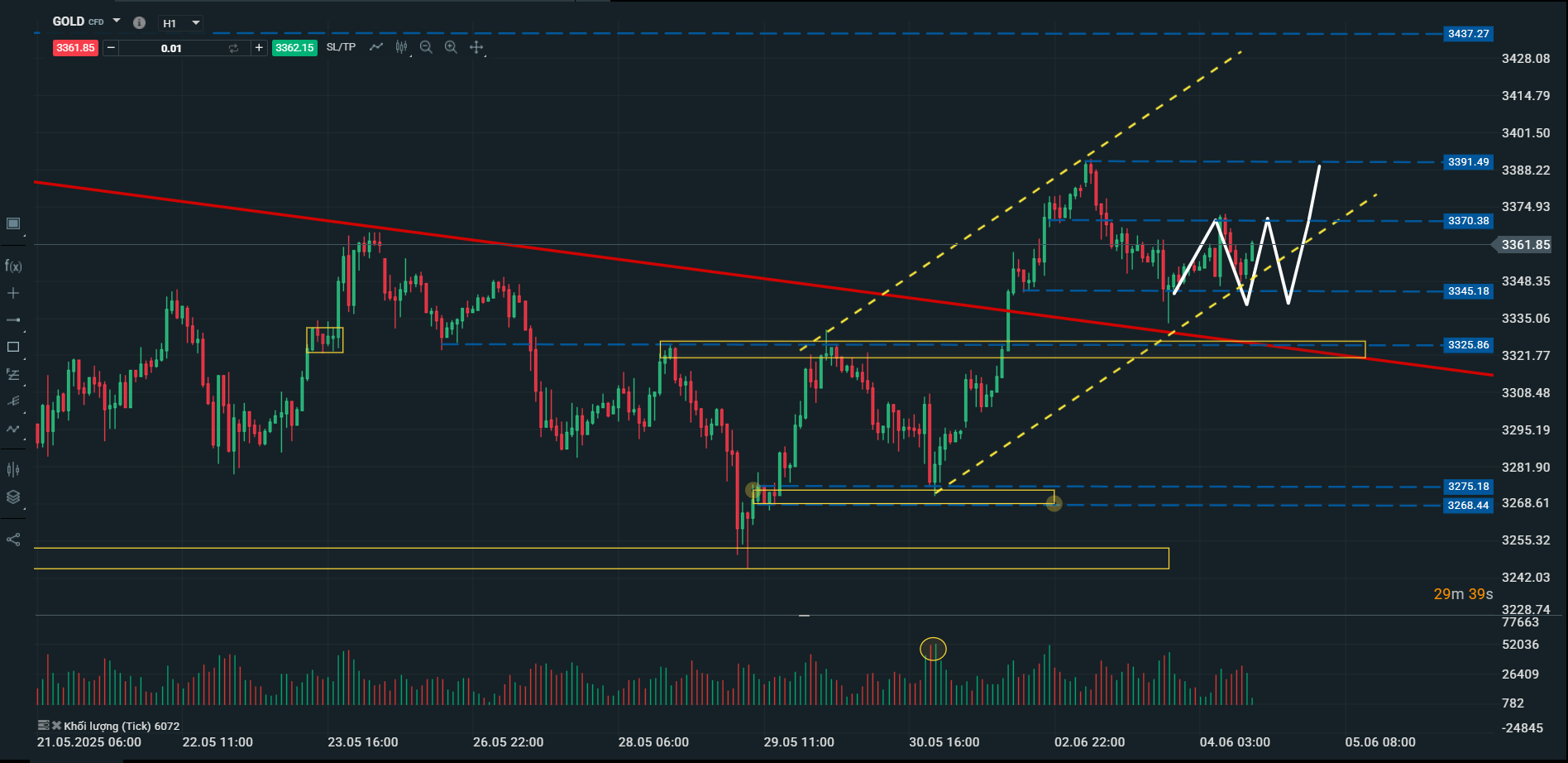 Ngày hôm qua thì giá Vàng cũng đã có một phiên điều chỉnh mạnh từ mức đỉnh 3.392 USD về vùng 3.333 USD/oz. Thấy rõ là sau khi điều chỉnh về vùng hỗ trợ quan trọng thì giá ngay lập tức rút râu và đẩy giá Vàng tăng mạnh trở lại. Hiện tại, giá cũng đang duy trì trong kênh tăng ngắn hạn (kênh màu vàng), chừng nào kênh này chưa bị phá qua thì ít nhất xu hướng tăng vẫn được duy trì. Tuy nhiên, với một tuần mà chúng ta có báo cáo cực kỳ quan trọng là NFP, thì khả năng giá Vàng sẽ có những đợt tích lũy trong biên độ tầm 40 giá để chờ đợi tín hiệu rõ ràng vào cuối tuần này.