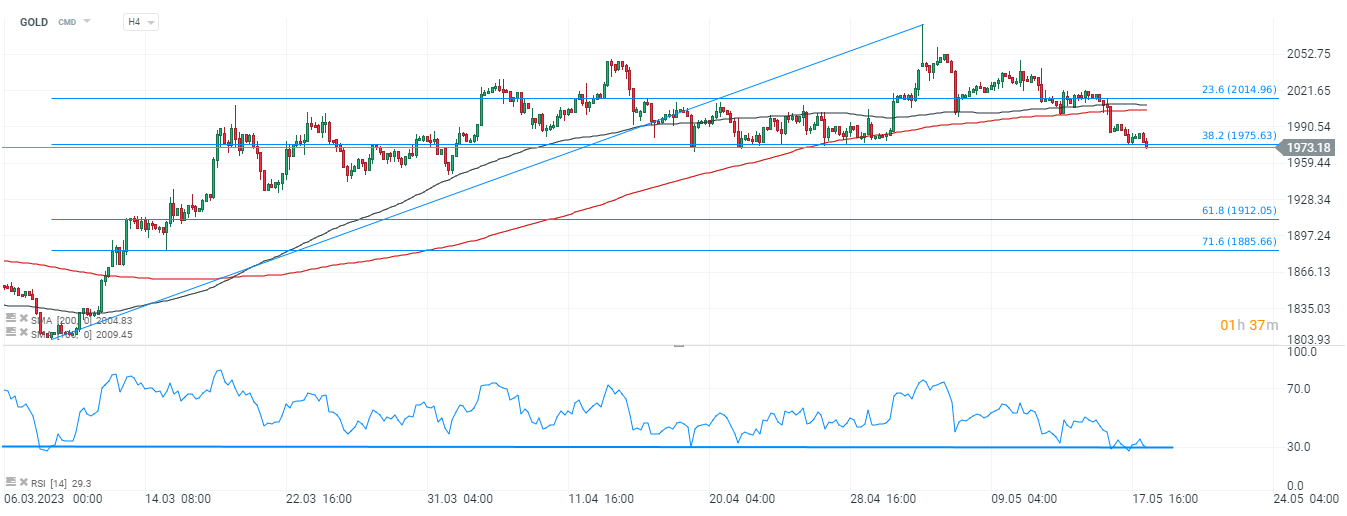 Đà thoái lui của Vàng đã không dừng lại tại mức Fibonacci 38,2 dựa trên đợt tăng ngày 10 tháng 3, khi giá vàng thỏi bắt đầu tăng theo làn sóng khủng hoảng ngân hàng, hiện tại giá vẫn rất gần với mức này. Chỉ số RSI đã giảm xuống dưới 30 điểm, báo hiệu tình trạng quá bán. Tính tại mức này, nhu cầu đã trở nên tích cực hơn trong những tháng gần đây. Dữ liệu vĩ mô gần đây từ nền kinh tế Hoa Kỳ cho thấy các số liệu trái chiều, nhưng xu hướng chung cho thấy nền kinh tế đang suy thoái, như những gì mà Chủ tịch Fed Cleveland trình bày, trong số những người khác.