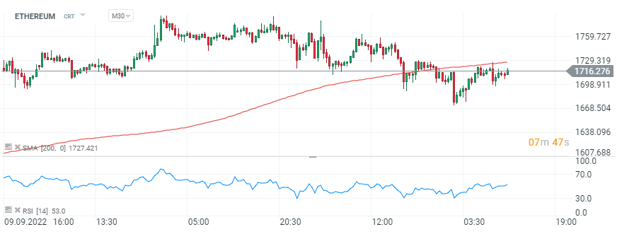 حيث استقر اسفل المتوسط المتحرك 200 جلسة على فترة نصف ساعة. و لقد برد مؤشر القوة النسبية وهو أعلى بقليل من 53. و يمكن أن تنذر إعادة الدخول المحتملة للسعر فوق 1730 دولارًا بحركة صعودية مهمة أخرى. و من ناحية أخرى ، فإن النفور من المخاطرة قبل قراءة التضخم في الولايات المتحدة يمكن أن يبقي التوكن أقل من متوسطه المتحرك 200 SMA. المصدر: xStation5
