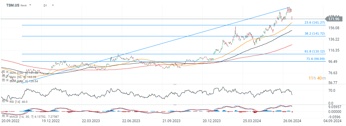 Taiwan Semiconductor Manufacturing (TSM.US) shares dipped nearly 8% yesterday, after the market discounted disappointing expectations in the ASML (ASML.NL) report and the prospect of tighter technology transfer between China and the US. Oversold stocks from the semiconductor sector pushed the Nasdaq 100, which yesterday recorded its weakest session since December 2022. However, today after TSMC's Q2 report for the year, we see some recovery on pre-market. Due to concerns about tightening US technology exports to Asia, TSMC has erased more than $50 billion in market capitalization in recent days.