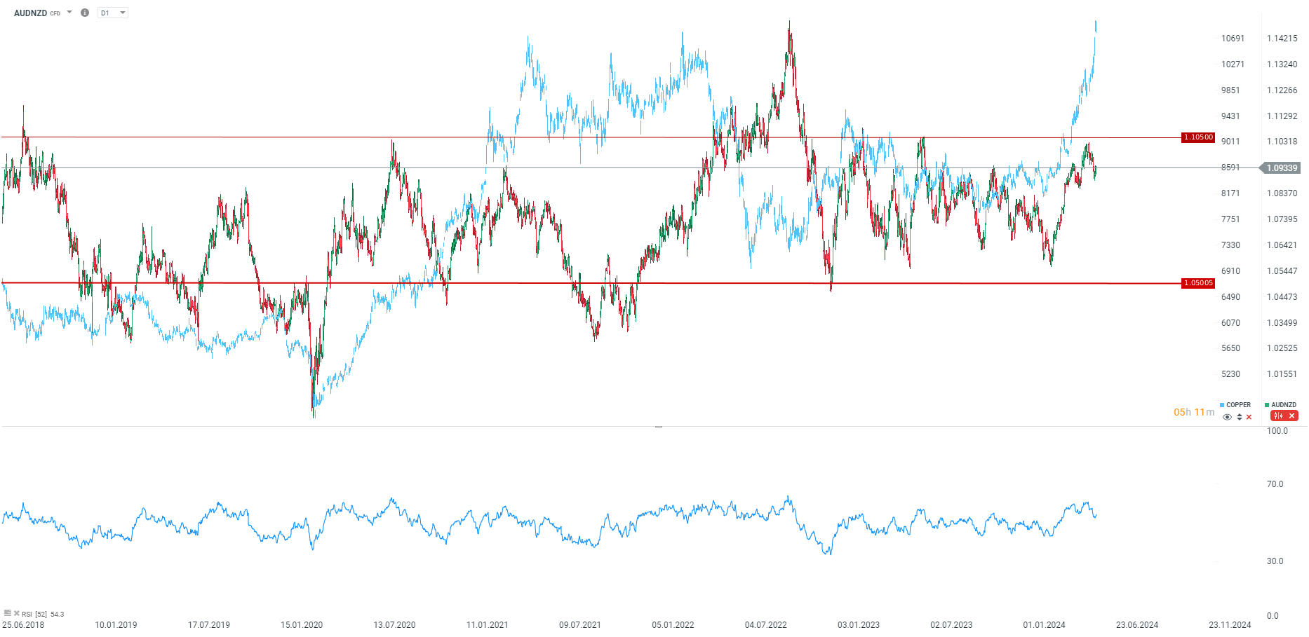 If there is indeed dovish communication from the RBNZ, then the pair could again break above 1.10. Of course, we are observing an interesting situation in which AUDNZD is at the upper limit of its multi-year consolidation. On the other hand, we have recently seen significant increases in industrial metal prices, which should benefit the Australian economy, although there is no significant correlation between AUDNZD and copper.
