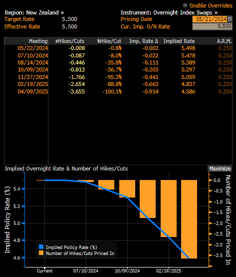The market is not pricing in any interest rate change from the RBNZ at tomorrow's meeting, during the Asian session. In fact, the market is not pricing in any move from the Reserve Bank of New Zealand until as late as November this year. In fact, that's when a full cut is priced in, although there is a combined chance that rates could be cut in October.