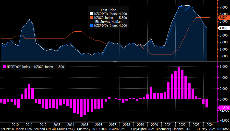 - New Zealand inflation is falling, although it was hoped that inflation could fall a bit more in Q1 and came in line with expectations. The difference between inflation and rates is not yet as wide as it was in 2015 when the rate cut cycle began.