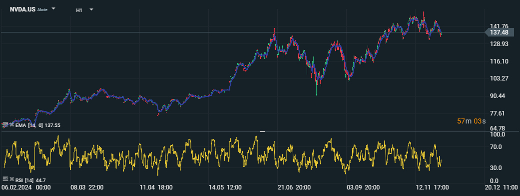 Roční hodinový graf společnosti NVIDIA Corp. (NVDA) – Vývoj akcií uprostřed právních výzev a růstu trhu s AI (únor–prosinec 2024). Zdroj: xStation5