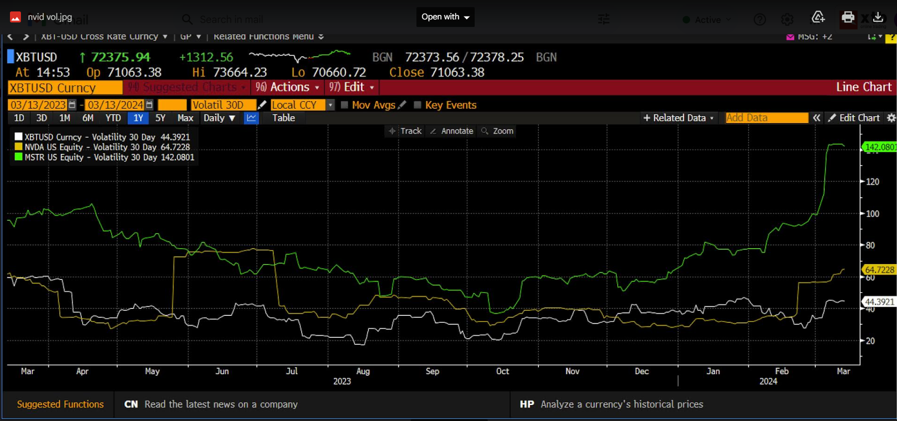 In the chart below, you can see 30-day volatility for Nvidia (yellow), bitcoin (white) and Microstrategy (green). This shows that Nvidia has higher short-term volatility than Bitcoin! Microstrategy has had a massive surge in volatility in recent weeks, largely due to it coming into the public’s consciousness due to its large holdings of bitcoin.
