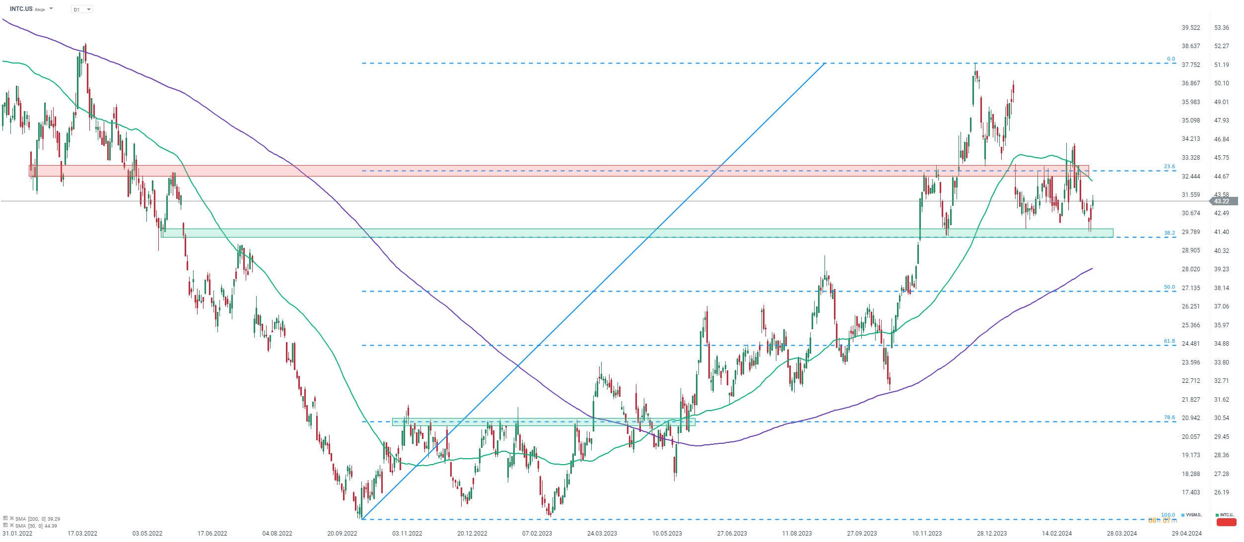 Last but not least, let's take a look at Intel chart (INTC.US). Taking a look at the chart at D1 interval, we can see that the stock tested the support zone ranging above 38.2% retracement of the upward move launched in October 2022 earlier this week, but failed to break below. A point to note is that this zone marked the lower limit of the ongoing trading range. A positive demand-side reaction to this hurdle as well as subsequent bounce suggest that the move towards the upper limit of the range marked with 23.6% retracement in the $45 area may now follow.