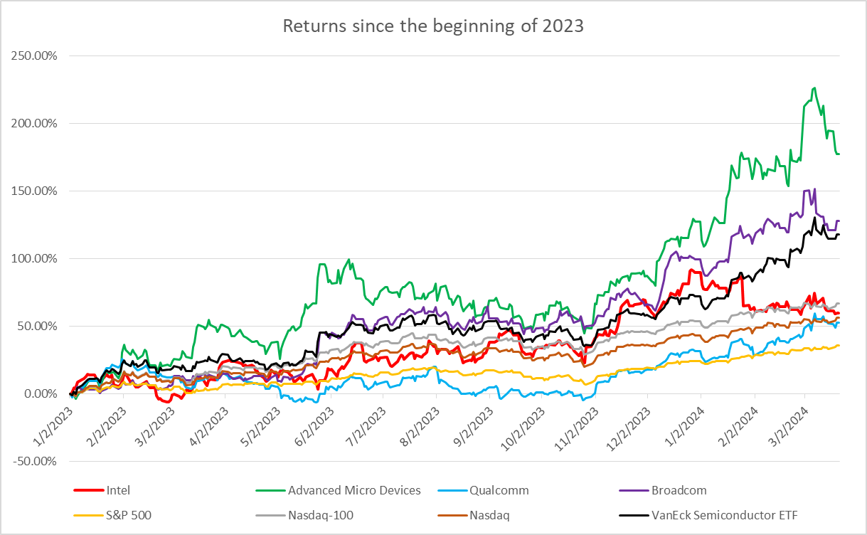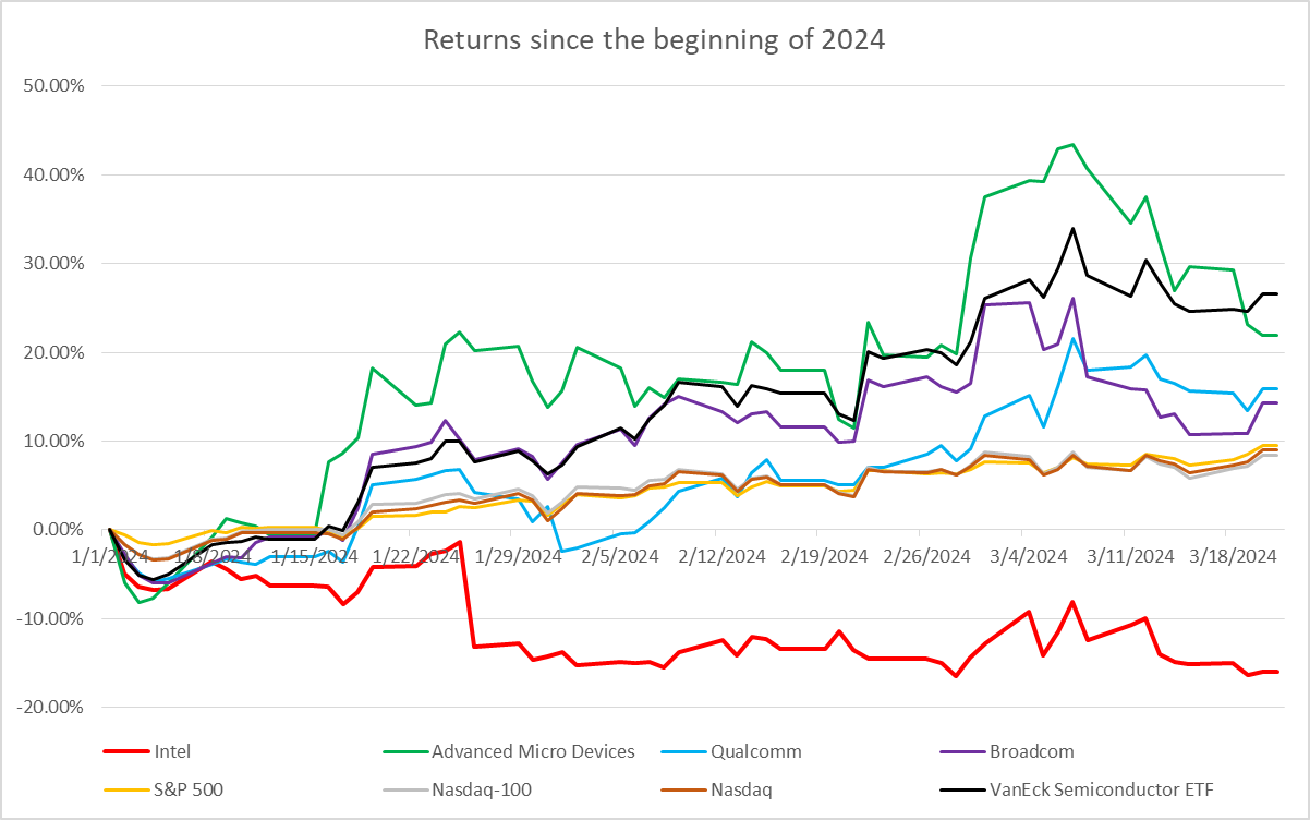 2023 was a very good year for semiconductor stocks, thanks to AI craze on the markets. However, was it also a good year for Intel? The first chart below shows performance of US semiconductor stocks as well as tech and broad market indices since the beginning of 2023 until now. As one can see, Intel has been a rather weak performer, lagging significantly behind companies like AMD or Broadcom. Intel also lags behind Nvidia, but this company was omitted from the chart as its gargantuan growth made the chart unreadable. The second chart below shows performance of the same assets, but with beginning of 2024 as a starting point. Intel has performed even worse in this comparison, being the only asset to trade lower year-to-date.