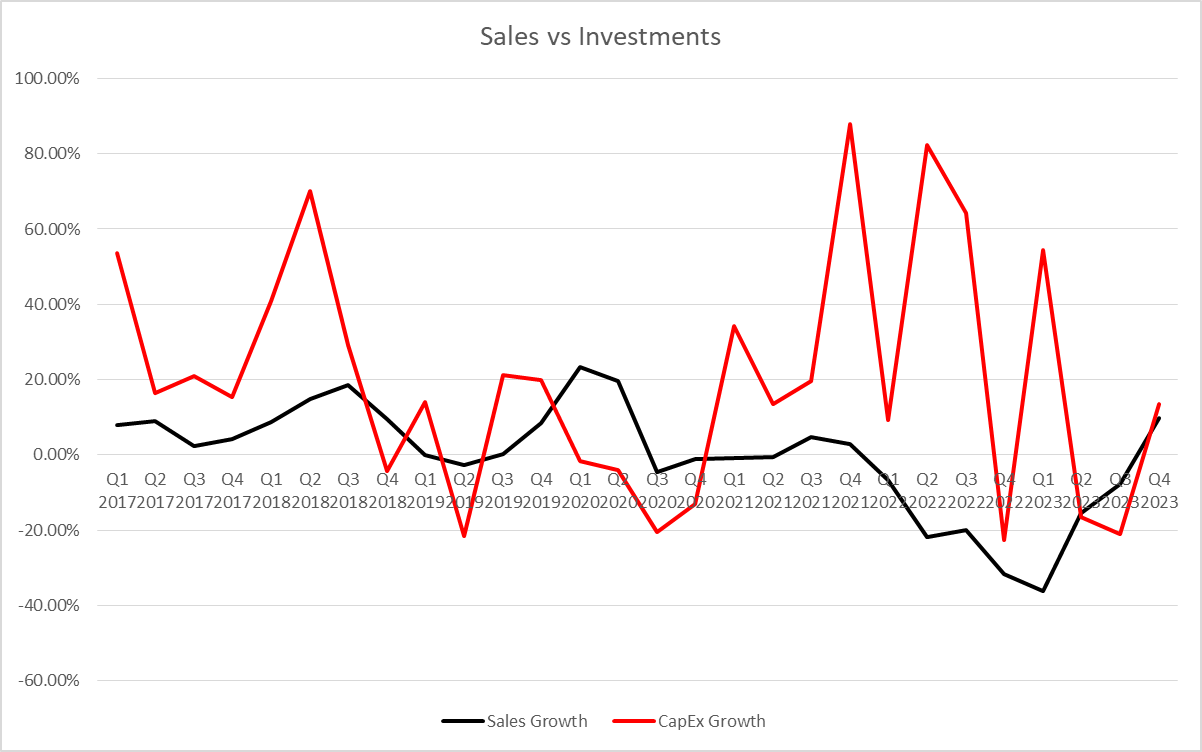 Grants, loans and tax credits will provide Intel with a massive financing and the company is likely to see much higher investments in the coming years. There is no perfect correlation between Intel's sales growth and its capital expenditures (CapEx) growth, but sales growth tended to be positive and accelerating at times of accelerating CapEx growth.