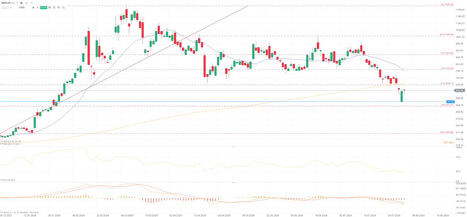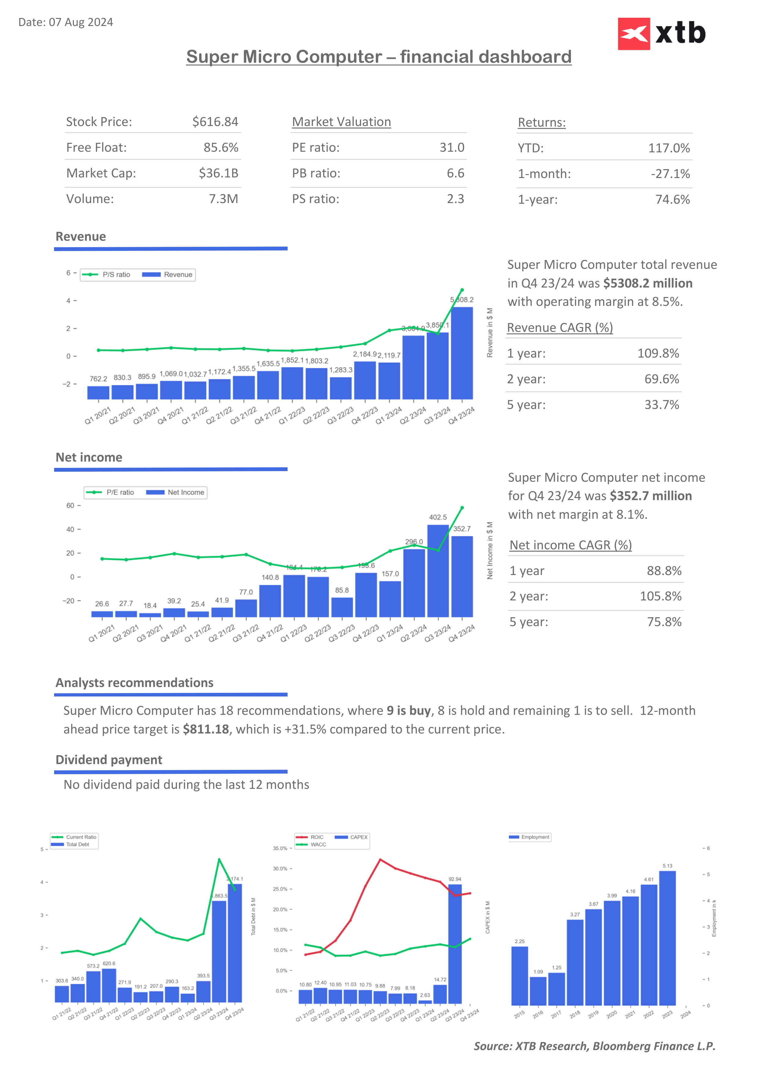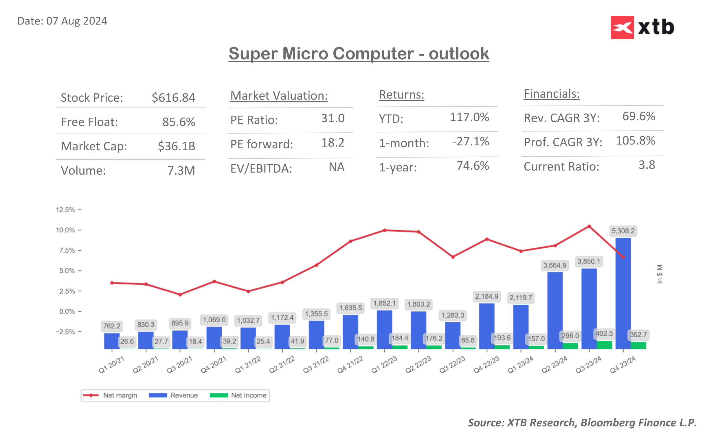 Super Micro Computer (SMCI.US) is down 11% in after-hours trading following the release of mixed results for the fourth quarter of fiscal year 2024, which fell short of some analyst expectations. The AI server manufacturer reported revenue growth in line with expectations but lower-than-expected earnings and gross margins. After weaker than expected earnings, Nvidia (NVDA.US) firstly slide 2% but now gains more than 1%; also SMCI lost almost 14% in pre-market earlier, while closer to US session open, declines are slightly easing. SMCI earnings were seen as a first (before NVDA report scheduled 28 August) signal of AI businesses and hardware investment trend.
