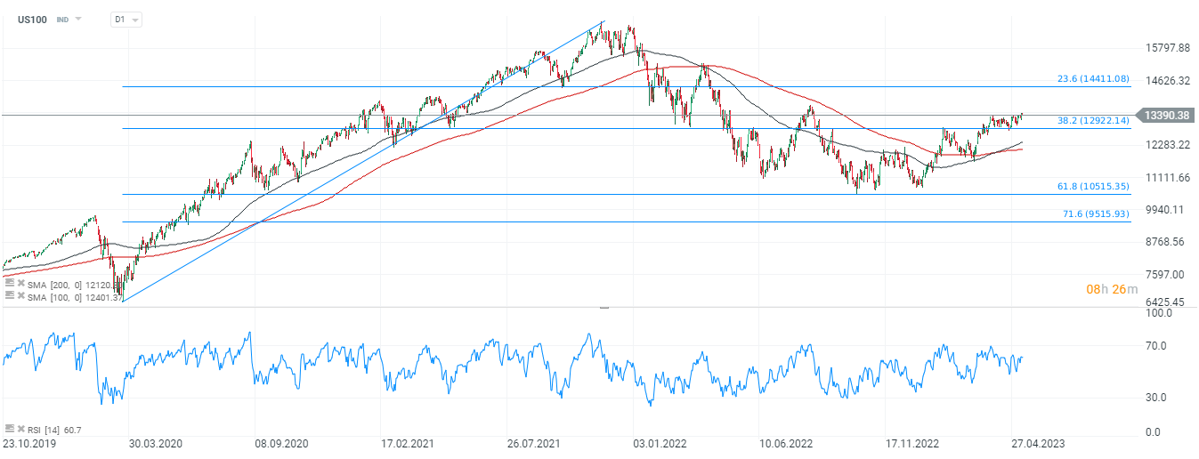 US100 started the session with declines, but looking at the bigger picture, we can see that it is still trading above the SMA200 and the key 38.2% Fibonacci retracement level of the upward wave from March 2020, which is around 12,900 points. However, if sentiment deteriorates in the coming days, the price may want to test the key support level. Source: xStation5.