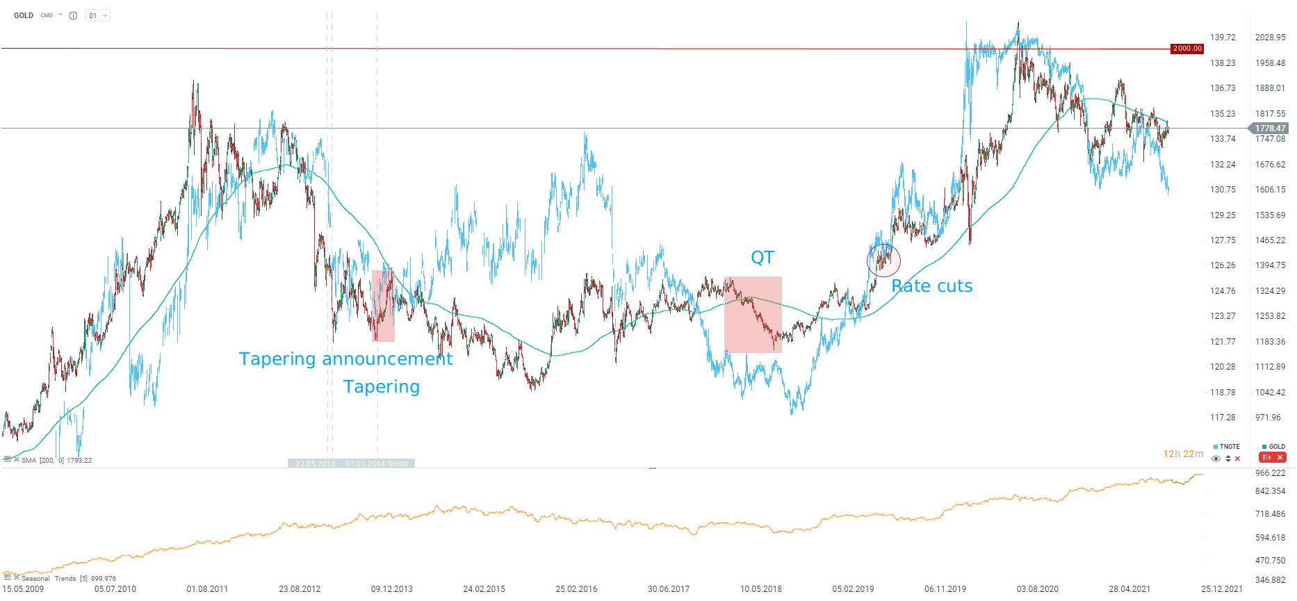 Taper announcement had just a brief, negative impact on gold in the past. Gold prices rebound later on. Situation looked similar when tapering actually began. It should be noted that subsequent gold price drops were a result of expected normalization of the US monetary policy. Source: xStation5