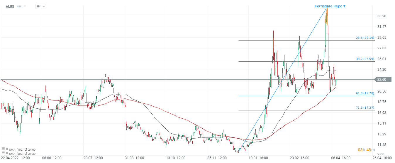 C3.ai (AI.US) shares, H4 interval. The stock is trading consistently in an uptrend and maintains momentum set by the SMA200 (red line) and the 61.8 Fibonacci retracement of the upward wave, initiated on December 28, 2022. In case of increases, the main resistance level could be the 38.2 Fibo retracement, near $26 per share, and the $29 level, where we see the 23.6 retracement level and previous price reactions. Source: xStation5