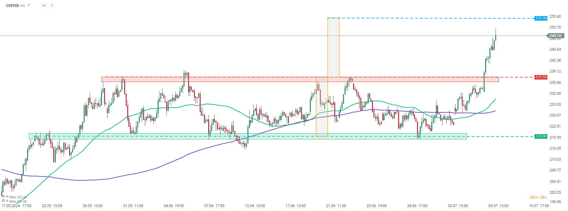 Taking a look at COFFEE at H1 interval, we can see that the price surged today and broke above the upper limit of the $220.00-237.50 trading range. Textbook target of the breakout from the range can be found in the $255 area, so just around 2% above current market price. Today's 7% surge marks the largest single day jump on the COFFEE market since late-November 2023.