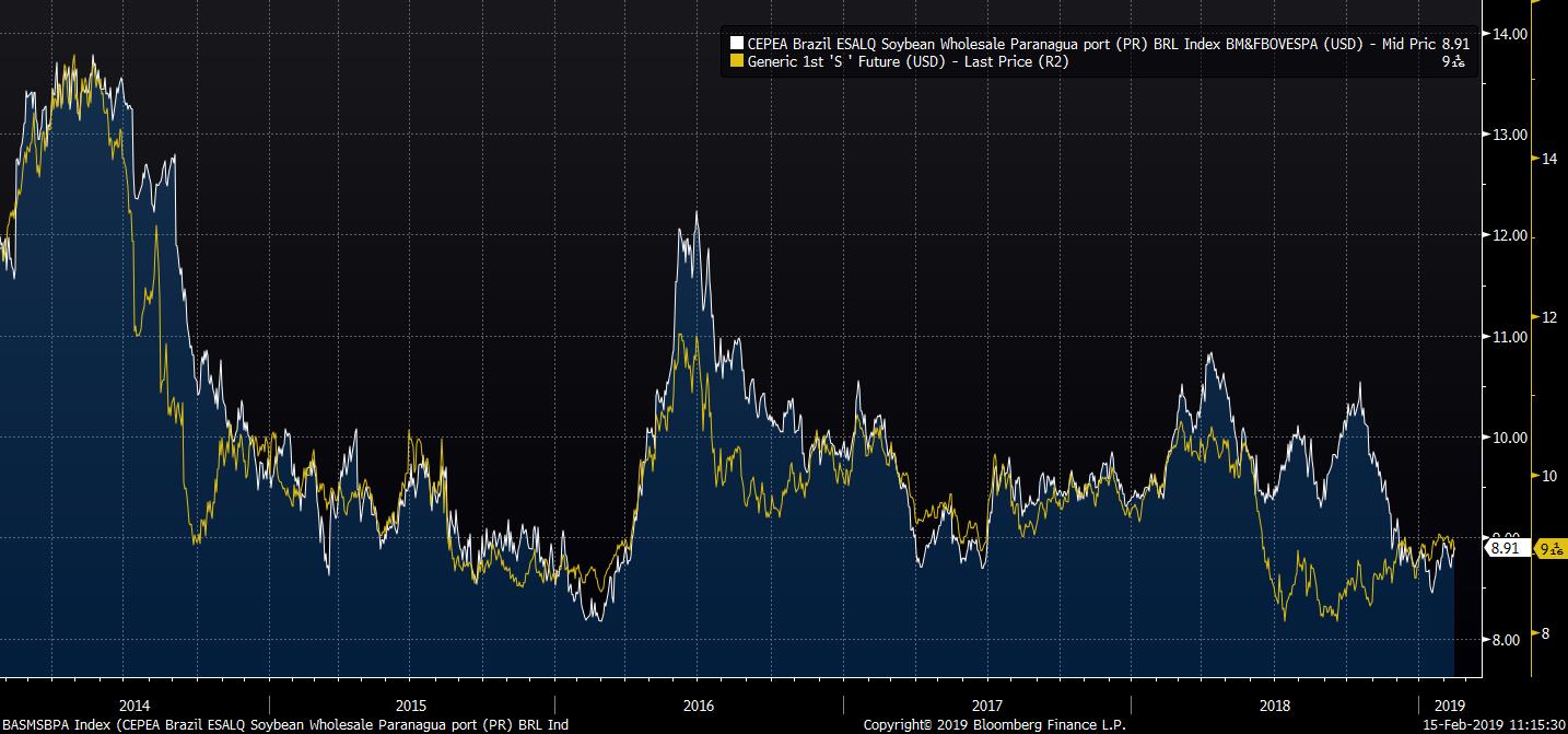 Brazilian soybean is already cheaper than US grain even as tariffs are excluded. If there is no trade deal one may expect US soybean could remain under pressure. Source: Bloomberg