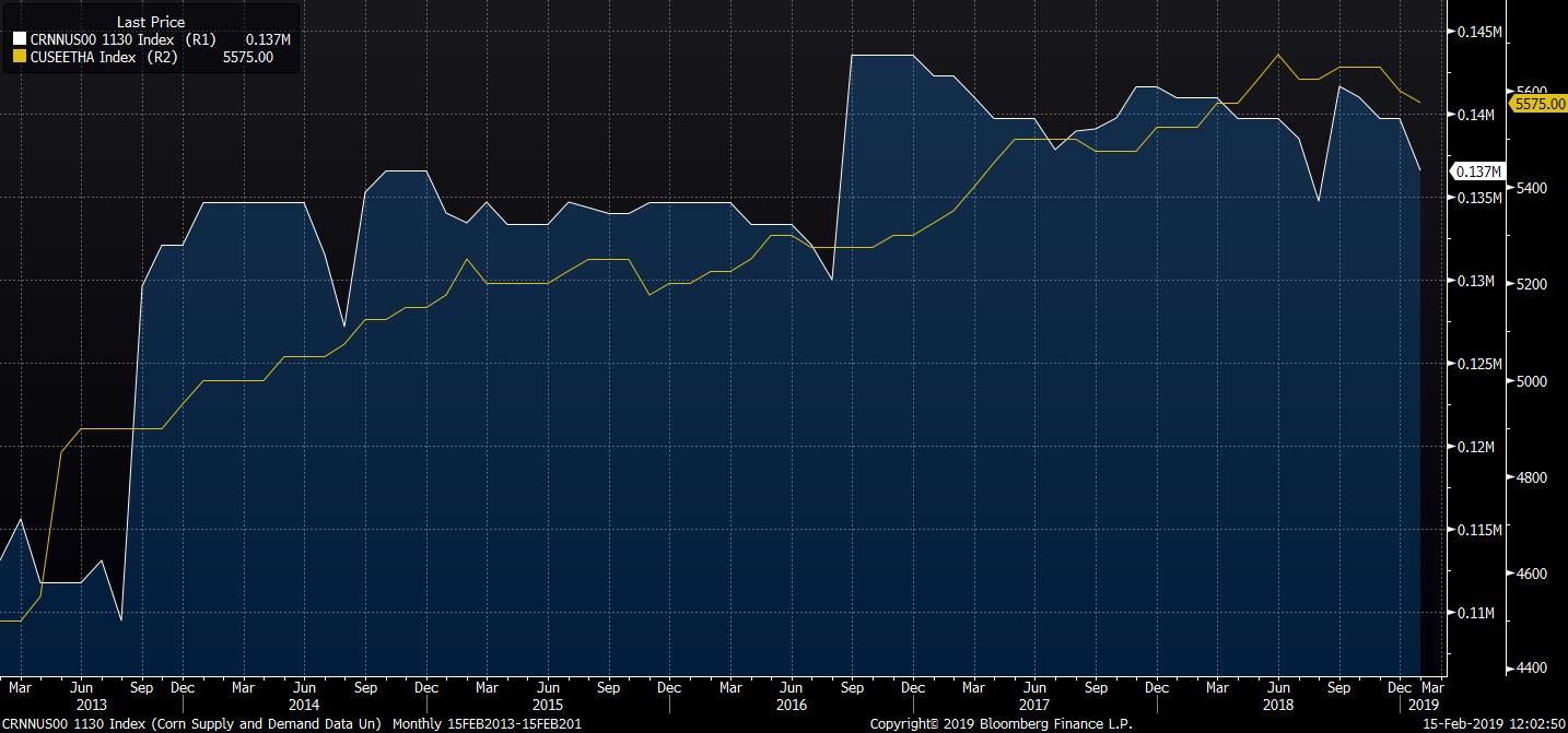 Amount of corn needed for ethanol production (white line on the chart above) as well as demand for dent maize (yellow line) is declining in the United States. Source: Bloomberg