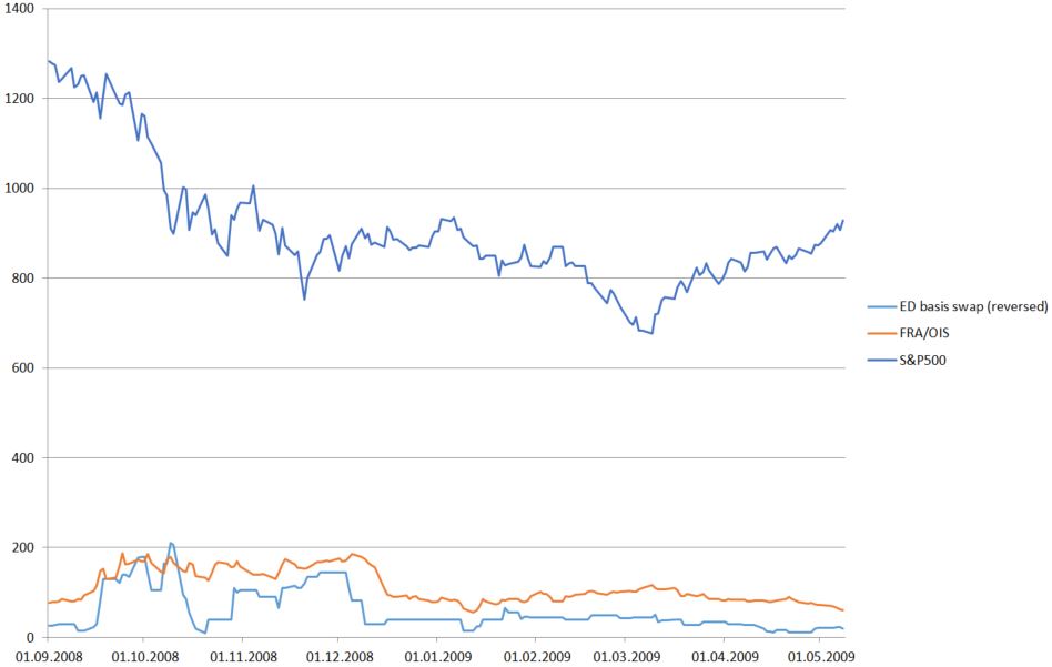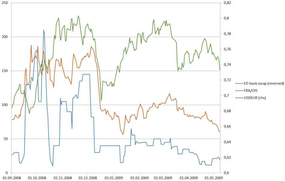 We use 3 month EURUSD basis rate and FRA/OIS premium as metrics of USD funding distress and start with comparison to the EURUSD or actually USDEUR (reversed chart for convenience).