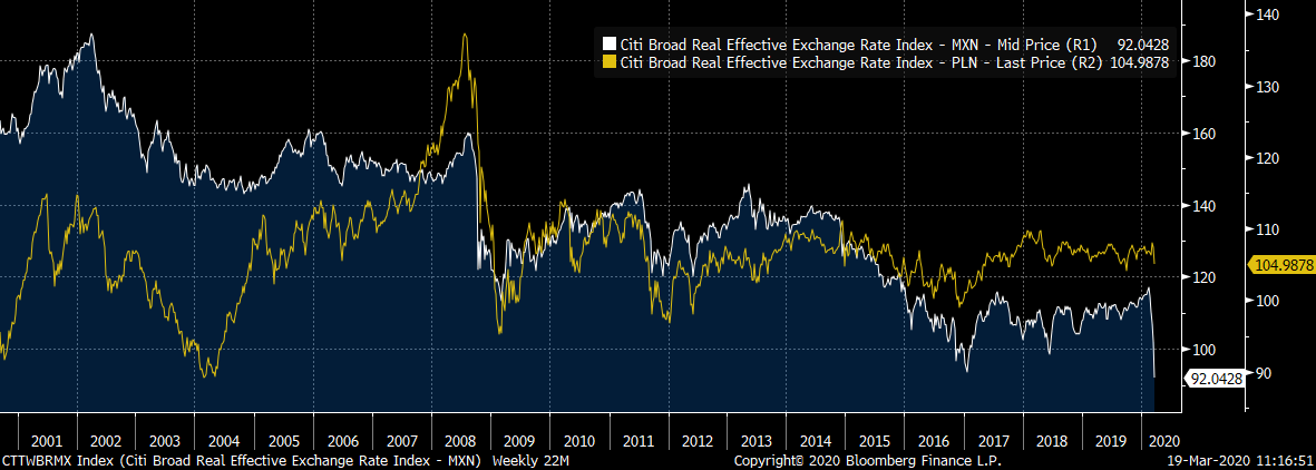First, do notice that EM currencies were entering the Lehman crisis overvalued (MXN) or extremely overvalued (PLN). Now the situation is strikingly different – most EM currencies are undervalued (here’s the trade weighted chart adjusted for inflation). So the entry point, probably limiting the downside but the dynamic is the same. Source: Bloomberg.
