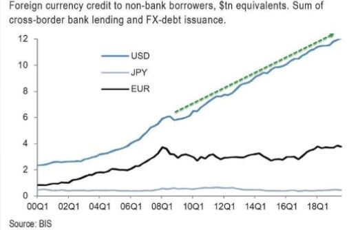 Since the global markets are USD centric, borrowers have little choice but to accept such exposure. Normally they can easily hedge themselves using swap transactions but if the market freezes they might be forced to buy USD on the spot market to for the contracts that they cannot rollover. Everyone at the same time. While the Fed launched USD swap lines with central banks, this has not worked out yet.