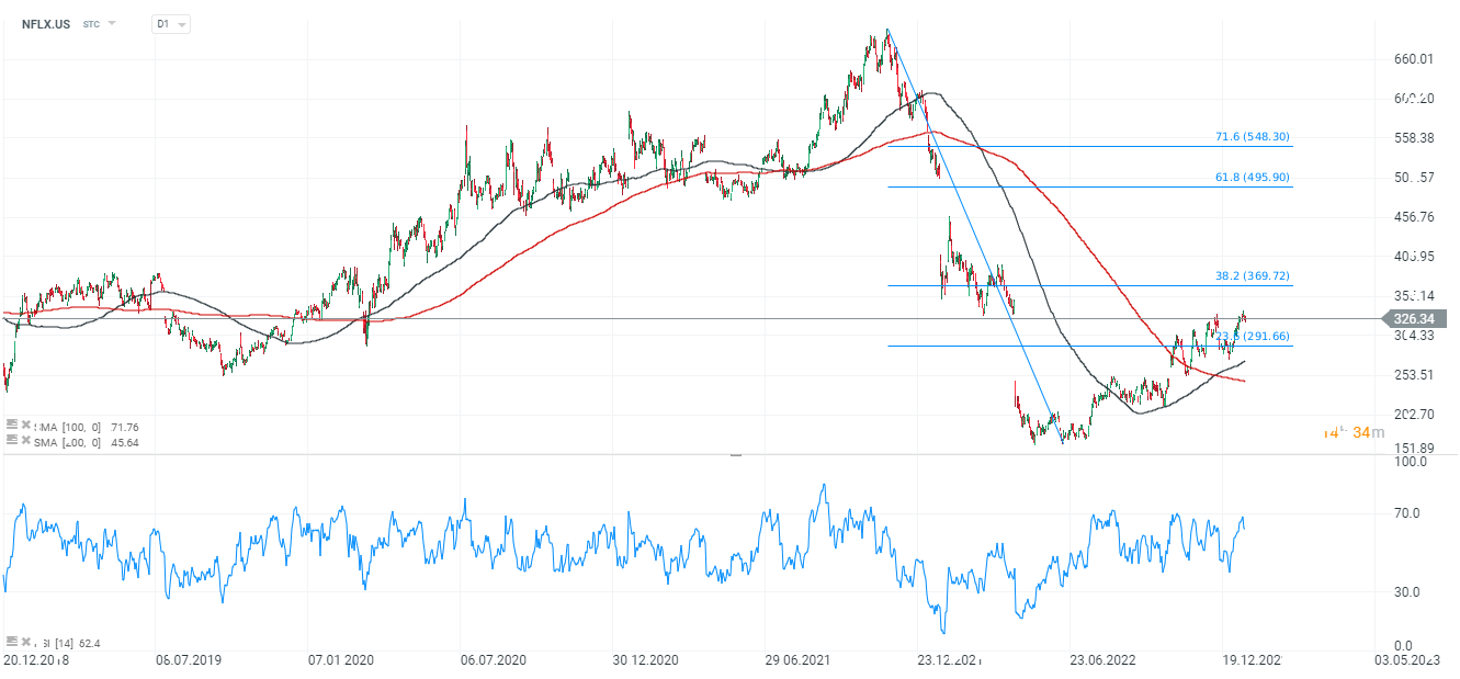Netflix stock (NFLX.US), D1 interval. Looking at Netflix's stock, we can see that the company managed to recover much of its losses in 2022 and eventually lost about 50% of its valuation. The price is located between the 23.6 and 38.2 Fibonacci abolition of the downward wave initiated in the fall of 2020 so the levels of $290 and $370 per share could potentially determine the range of a positive or negative market reaction. The SMA100 (black) and 200 (red) averages formed a 'golden cross' formation in mid-December, which may support the bulls. Source: xStation5