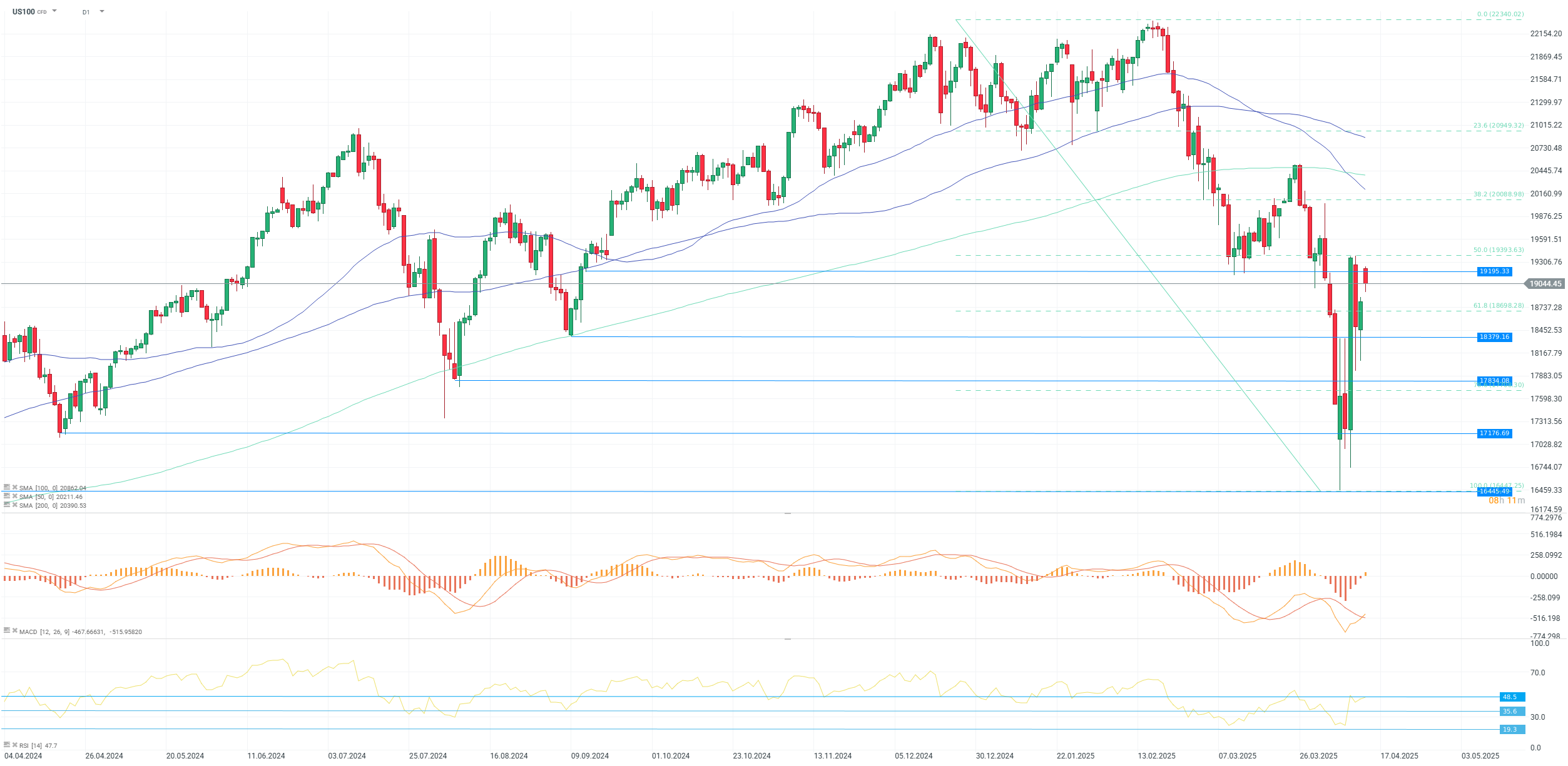 Los mercados globales están registrando subidas hoy, liderados por el sector tecnológico, tras las exenciones arancelarias para teléfonos inteligentes, computadoras y chips de memoria. En América, los principales índices muestran un comportamiento positivo: el Nasdaq 100 (US100) sube un 1,40 %, el S&P 500 (US500) gana un 1,21 %, y el Dow Jones Industrial Average (US30) avanza un 0,86 %, mientras que el índice de volatilidad VIX cae un -8,74 %.