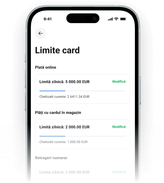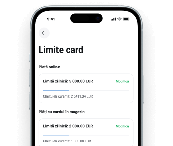 Controlează-ți eficient cheltuielile și setează limite pentru transferuri, retrageri sau plăți cu cardul.