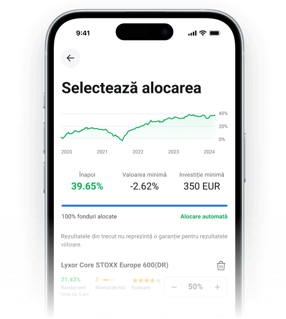 Alimentează-ți contul în mod regulat cu Investițiile Automate. Pur și simplu selectezi suma, perioada și metoda depunerii, iar fondurile tale vor fi investite automat în ETF-uri alese de tine, în conformitate cu alocarea Planului tău de Investiții.